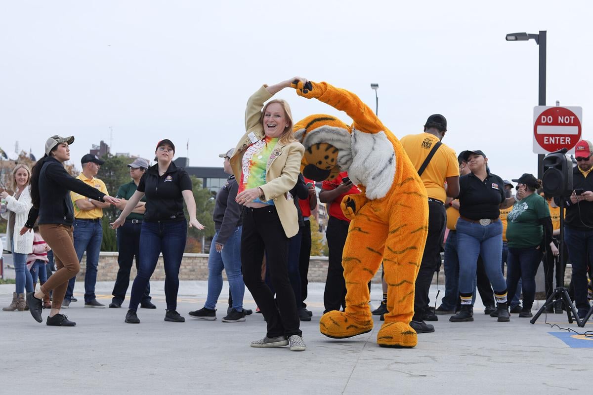 Raising Cane's employees do the Cha Cha Slide with Truman the Tiger on Tuesday at Raising Cane's in Columbia.