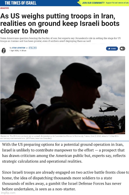 It seems unlikely that Israel would commit troops to a ground invasion of Iran. Why would they since the United States does all their dirty work?