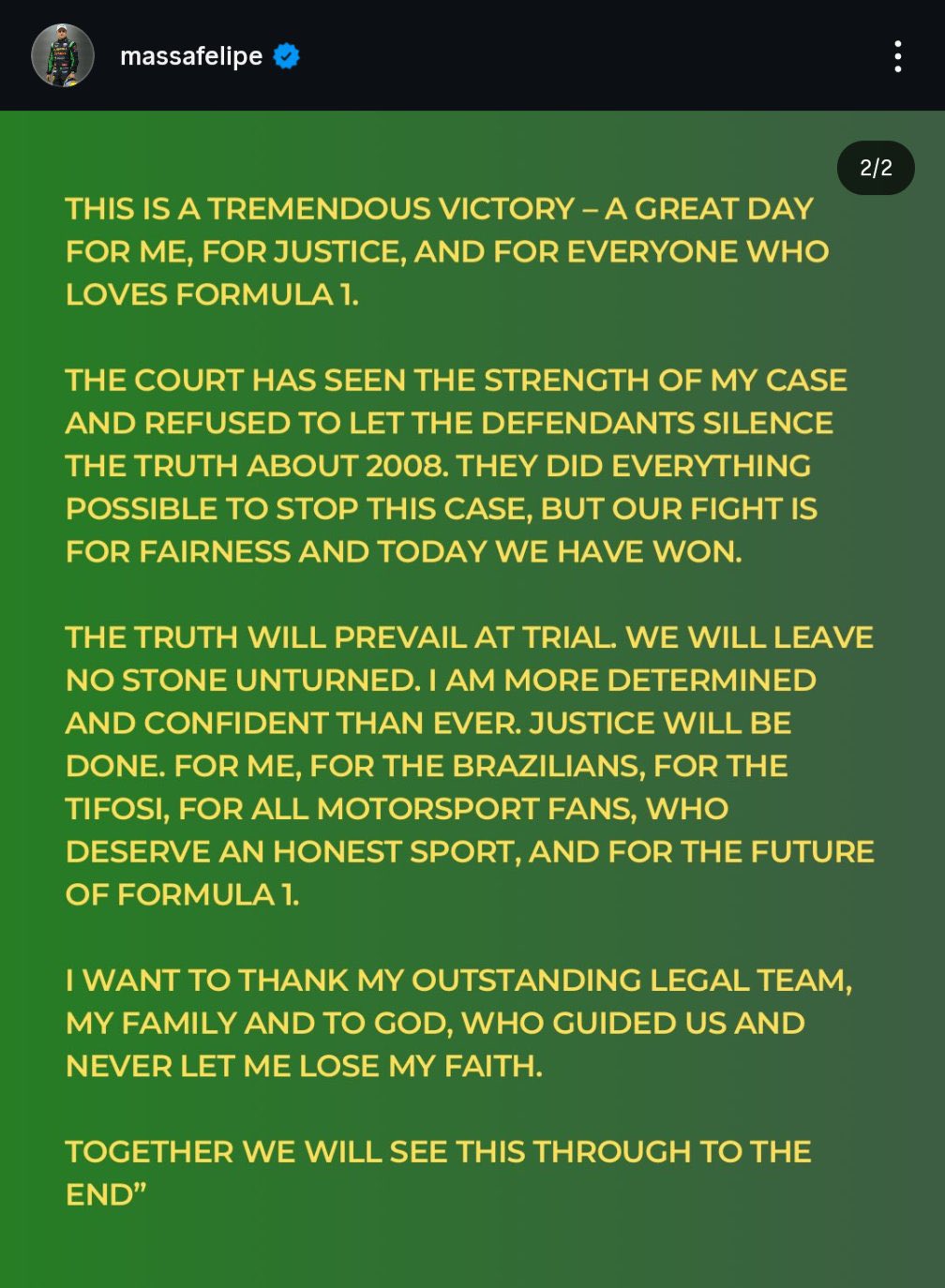 Looks like the tweet from the FIA account has been community noted. A lot of confusion on what exactly happened with Felipe Massa’s case today. He says he won.