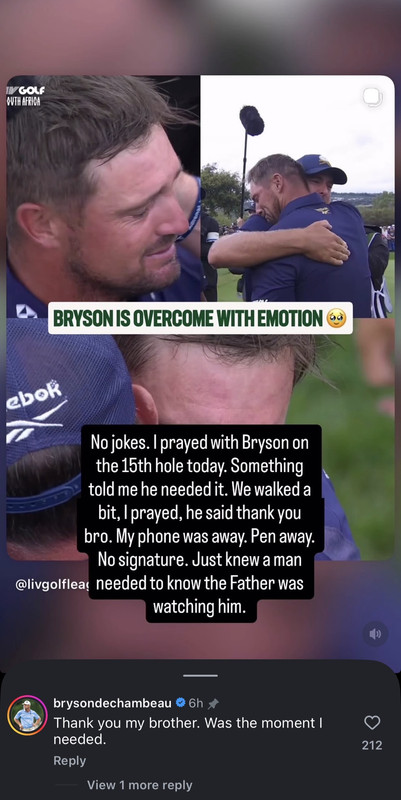 After the tournament, he spoke about “an interaction with a fan on 16”. Turns out there was a fan that prayed with him there. Pretty cool story but I’ve only been able to find this post on instagram that Bryson commented on