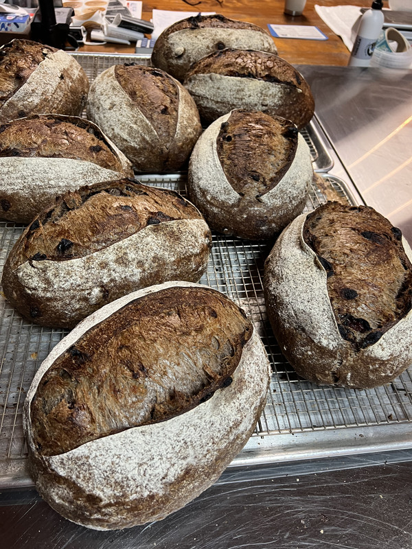 I am baking the dark chocolate, white chocolate, dark cherry, a big Khorasan whole grain hearth loaf, a khorasan sandwich loaf and the miso, molasses, multigrain seeded sandwich loaf.