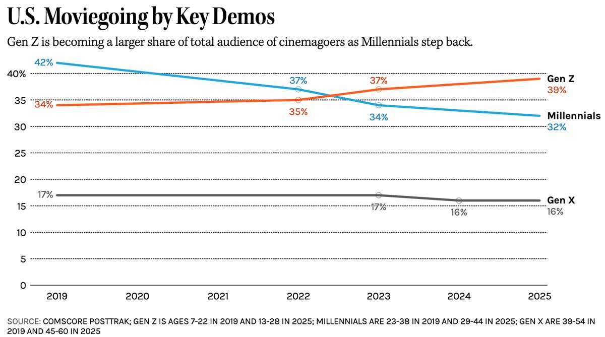 Gen Zers are becoming a larger share of the total moviegoing crowd. In 2025, they represented 39 percent of the audience in North America, up from 34 percent in 2019, per Comscore PostTrak exit polling data shared with The Hollywood Reporter. And leading theater trade organization Cinema United touted that Zoomer theater attendance grew by 25 percent the past 12 months.