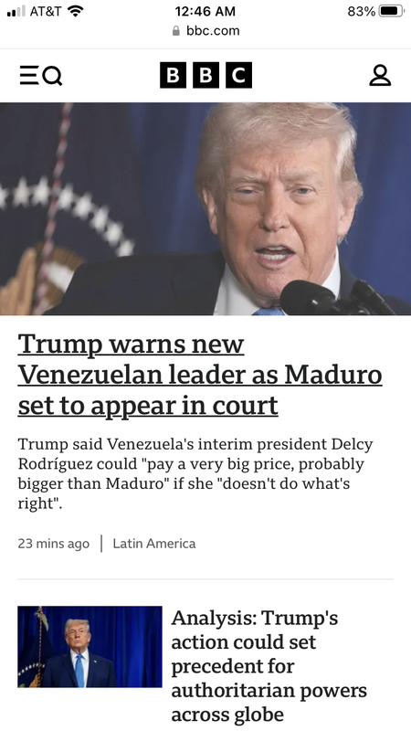 Said repeatedly to the BBC that Trump violated domestic US and international law, that Maduro’s capture was illegal under US and international law, and that Trump committed an impeachable crime. Said that the Congress will address this action next week and stop Trump.