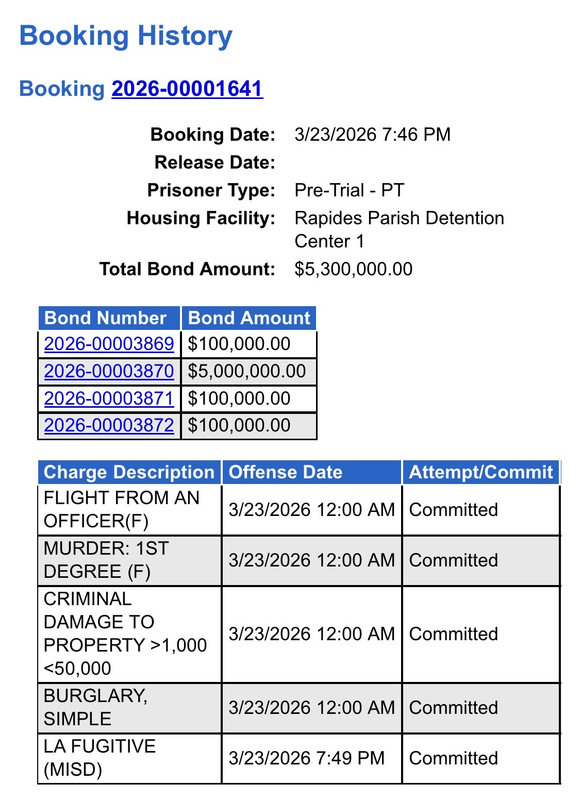 Authorities deployed spike strips and stopped the suspect at LA 28 and Cloverleaf Boulevard, where they were arrested without further issue.