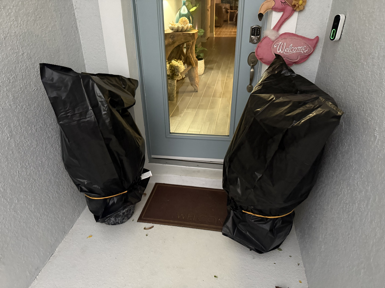 I didnt want the wind and cold to get to them so I just put some trash bags over them and bungied them to the bottom. This gonna be OK? I can roll these around and put them in the garage If I need to. Not a big deal. I dont want them to die.