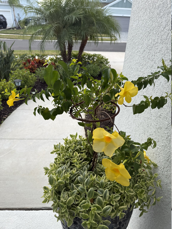 I have two of these pots on my front porch. They have Baby sunrose that I grew in there from 4 cuttings in each pot. LOL. I love the sunrose, I have great success with it. I added some mandevilla and some Allamanda sprigs in the middle early last summer and they have taken off. I get constant white and yellow blooms in the middle and I have to cut the sunrose all the time to keep it off the ground. I recently made a huge cut back.