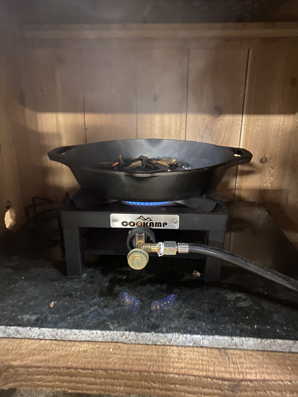 I plan on putting some grating above the skillet to place a drip pan on. I’ll probably put some flashing around the bottom too to protect the wood from charring and catching fire.