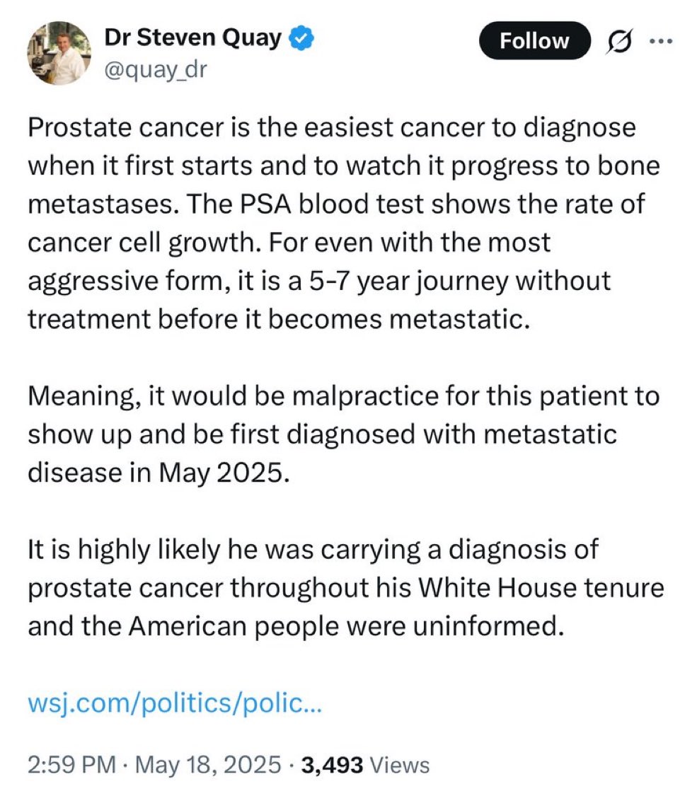 re: Former President Joe Biden was diagnosed with an "aggressive form" of prostate cancer